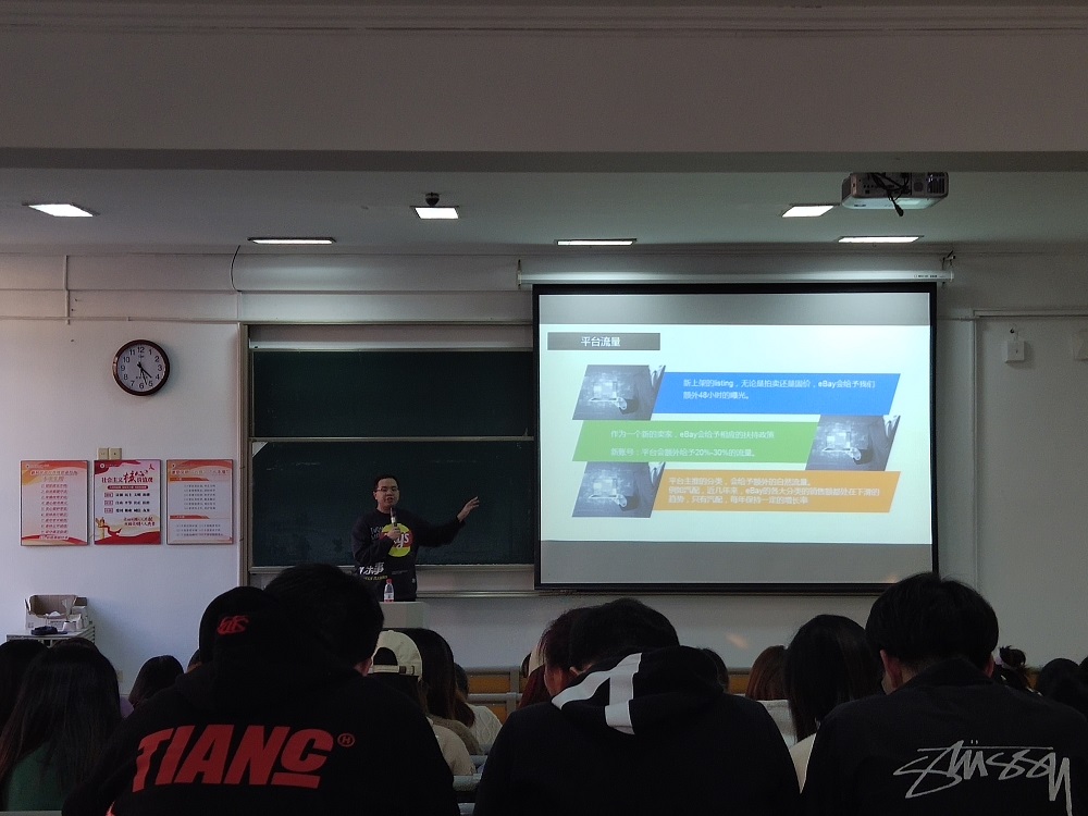 11月10日,浙大宁波理工学院外国语学院组织的跨境电商企业人员专题系列讲座第三场如期举办,此次讲座邀请国际电商平台eBay的官方培训师杨健镭作主讲人,他拥有丰富的跨境电商从业经验。英语和商务英语专业的学生参加了此次讲座。