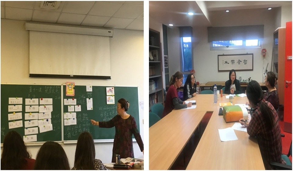 图:孔子学院段老师在讲授汉语(左),大家在汉语评课活动中的交流讨论(右)