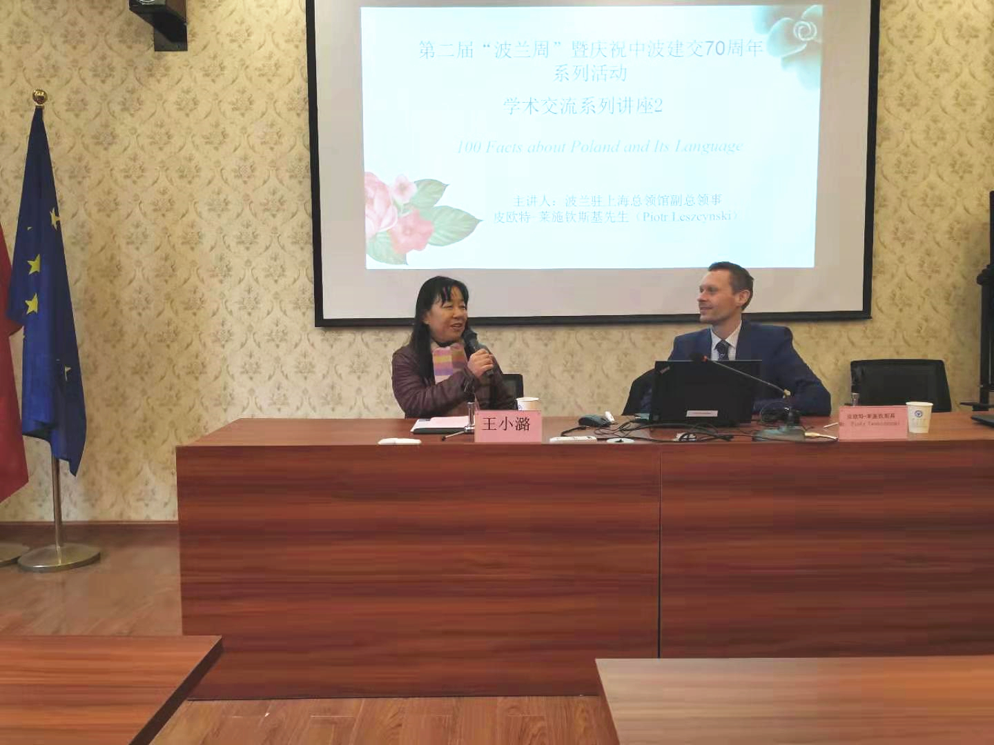 2019年11月29日上午,在波兰研究中心SC106,波兰驻上海总领馆副总领事皮欧特–莱施钦斯基先生为理工师生作了题为“波兰与波兰语言的”讲座。本次讲座是第二届“波兰周”暨庆祝中波建交70周年系列活动之学术讲座第二讲,由外国语学院院长、波兰研究中心主任王小潞教授主持。