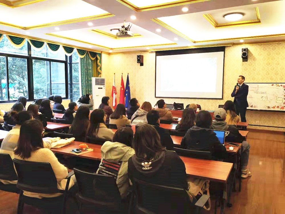 副总领事先生介绍了波兰语言的历史演变以及波兰语的方言现象。他从波兰历史起源的视角,讲述了属于斯拉夫语系的波兰语的拼写、发音、用法等方面的独特性。其讲述过程恰到好处地穿插了波兰语与汉语的比较对比,引起在场师生的浓厚兴趣。不少师生在现场就跃跃欲试,开始练习波兰语发音。