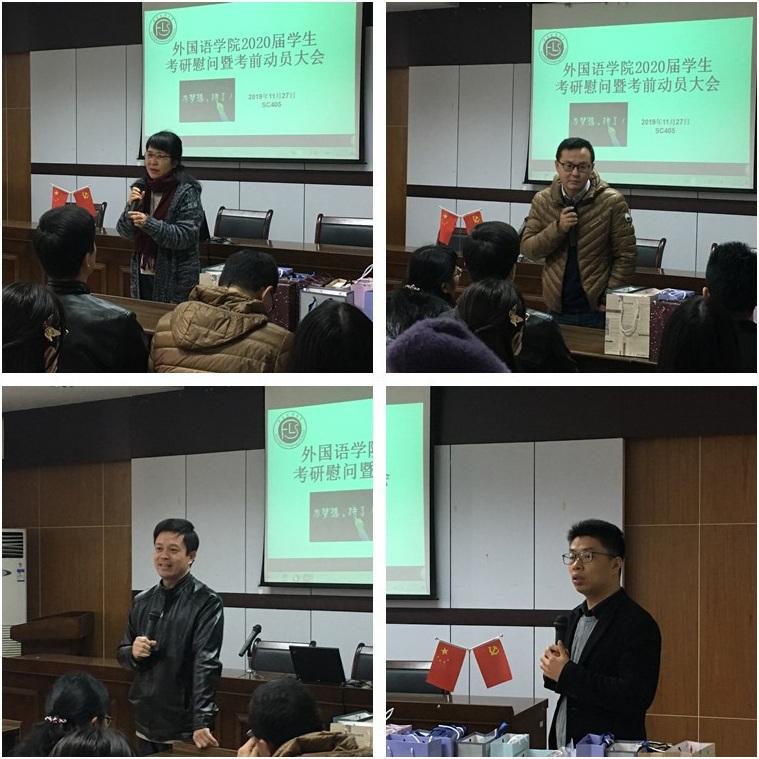 11月27日上午,在距离考研还有23天,外国语学院党委书记傅晓宇老师、副院长蔡亮老师、副院长周汶老师,党委副书记任凯老师以及学工办全体辅导员老师一起看望和慰问了2020届考研的同学们。
