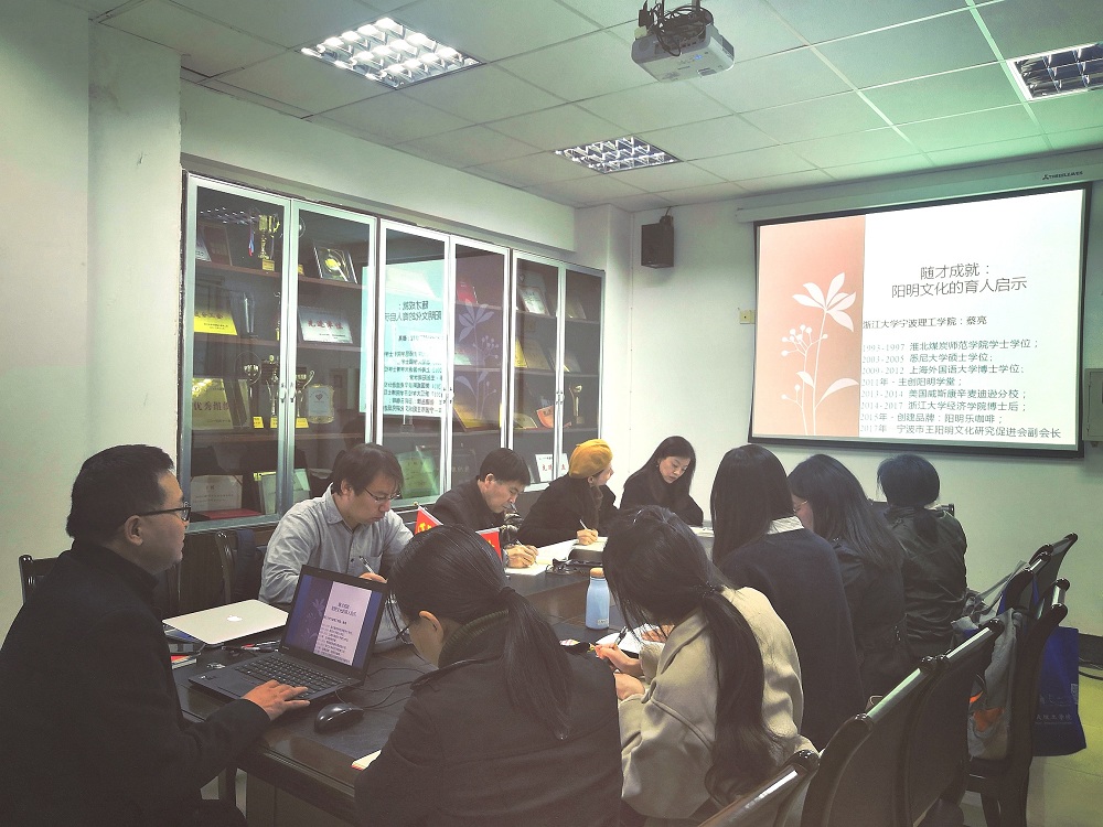 蔡亮教授以“阳明文化与育人工作的启示”为主题,以王阳明思想及其在习总书记治国理政思想中的体现为重点,带领支部教师党员梳理了阳明思想的流变、领会“知行合一”的时代内涵,生动形象、内容丰富。