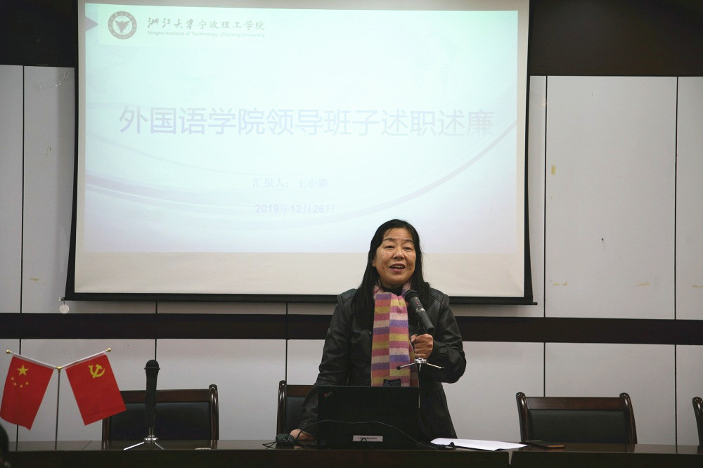 首先由王小潞院长作了2019年外国语学院领导班子述职述廉工作报告。她回顾了过去一年里学院领导班子在廉政建设、教学与科研、师资队伍建设、教育国际化、学生实践和特色平台等方面所取得的成绩。同时,分析了学院在师资队伍建设、教学科研能力提升,大学英语教学改革,科研团队培育和学生素质教育等五方面存在着不足,并提出了今后努力改进的方向与办法。随后王小潞院长、傅晓宇书记、蔡亮副院长、周汶副院长和任凯副书记分别就个人分管的工作进行了述职述廉汇报。