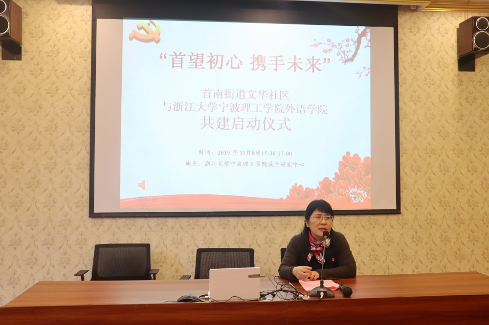 活动伊始,首先由外国语学院党委副书记、学院副院长傅晓宇致辞,她指出,此次共建,首先是实现党建共建,文华社区党支部和浙江大学宁波理工学院外语学院学生党支部的长期共建;其次,是基地共建,基于双方的良好平台,继续深入发掘优质资源,实现多方位的互通;同时也关注文化共建,丰富的高校资源和浓厚的中西学术氛围相结合,既传承和发扬中国优秀传统文化,又吸收优秀西方文化,文化交融,共建文化。接着是首南街道党工委副书记周明峰讲话,他指出,首南街道文华社区所辖地区,高校资源丰富,有浓厚的学术气息及国际化氛围,加强社区和高校的交流,从而充分实现资源互通、学习互通、文化共建。