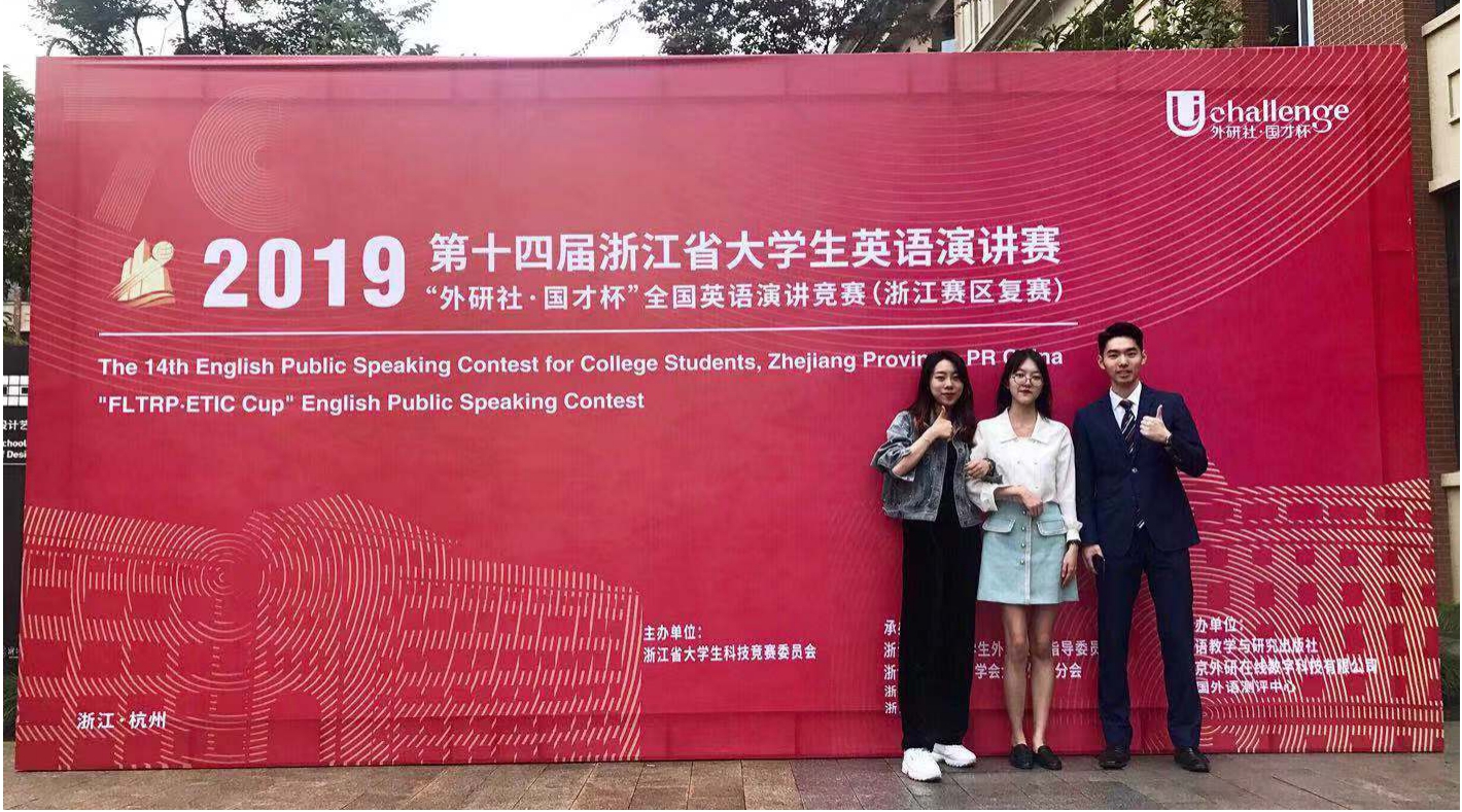 10月26-27日,浙江大学宁波理工学院外国语学院的张韶恬同学和商学院的陈柏闻同学在外语教师周维的带领下,代表学校参加了由浙江工业大学承办的第十四届浙江省大学生英语演讲竞赛暨2019年“外研社·国才杯”大学生英语演讲大赛浙江省复赛。在两日的激烈比赛中,两位选手信心满满,展现自我,最终,陈柏闻同学荣获三等奖,张韶恬同学荣获优秀奖。
