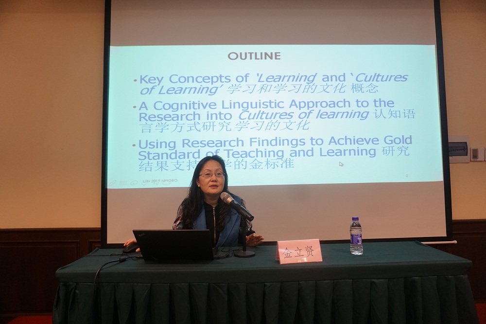 首先,宁波诺丁汉大学的金立贤教授作了题为“A Cognitive Linguistic Approach to Research Cultures of Learning for Internationalised HE Contexts”的专题发言。金立贤教授探讨了学习文化的定义,并以她在中英不同学校的工作经历,展示了学生个体学习文化的差异。她指出诱导式隐喻研究可产出质性和量性的数据结果,适用于研究多种场合的学科人群,如媒体研究、跨文化沟通、语言障碍和商务分析等。
