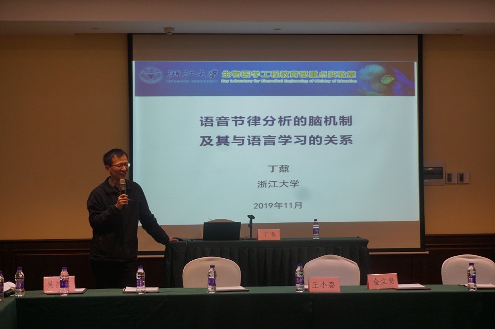 接着,浙江大学的丁鼐研究员作了题为“语音节律分析的脑机制及其与语言学习的关系”的专题发言。他指出层级结构的同步响应可以客观地反映二语水平,短期语言学习可以迅速激活大脑言语网络,功能磁共振为评估不同语言学习策略提供了获取客观依据的研究手段。