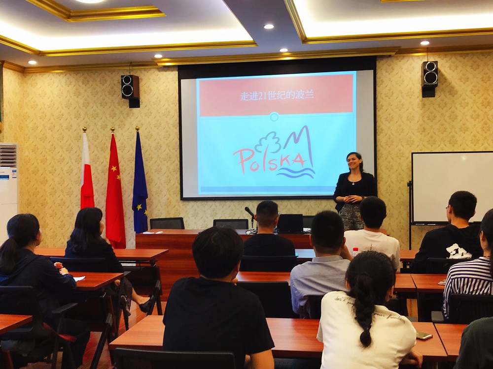 2019年6月20日下午,在波兰研究中心SC106,波兰籍教师杜霞(Daria Belch)风雨无阻,不辞辛苦地为我校师生带来了一场视听盛宴《走进21世纪的波兰》。波兰研究中心主任王小潞教授亲临现场并主持讲座,中心副主任胡海鹏老师、陈黎峰老师及其他相关老师悉数到场。很多学生慕名而来,现场座无虚席。