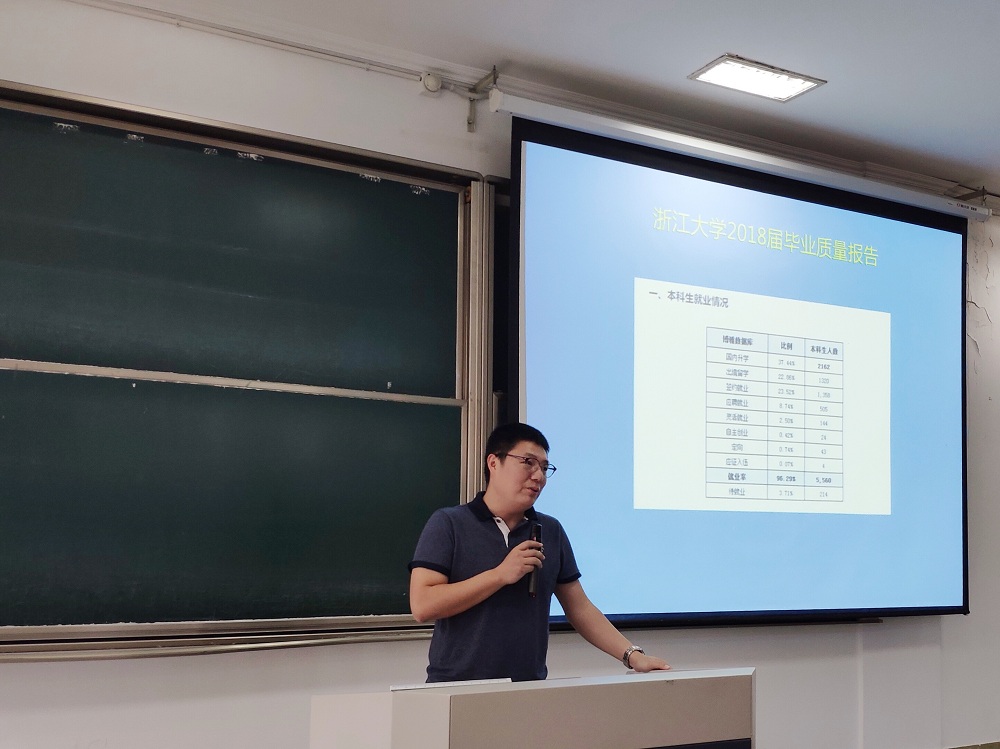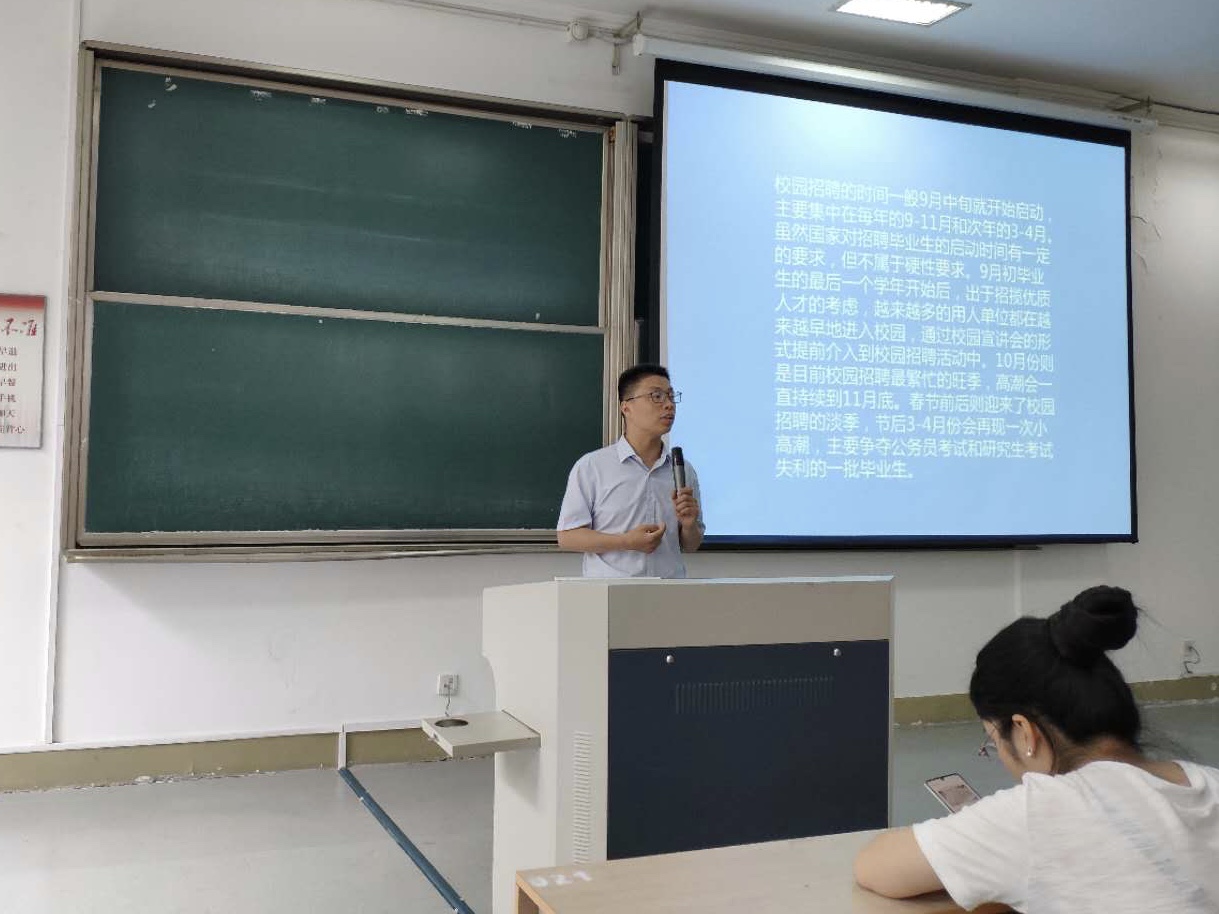 接下来,传媒与设计学院的张峰老师向同学们介绍宁波南部商务区和学校周边用人单位的人才招聘概况,同时将我校学生前段时间投递简历量与其他院校进行比较,建议同学们应积极投递简历,增加面试和实习的机会,为今后走上工作岗位做好前期准备。