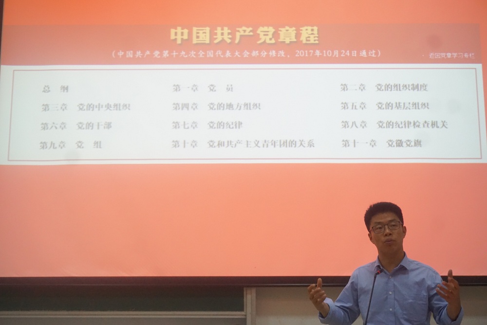 为进一步深化“不忘初心、牢记使命”主题教育学习,落实学院主题教育有关部署,10月9日晚,学院党委副书记任凯老师在SB104教室为2019学生上了入党启蒙专题党课。