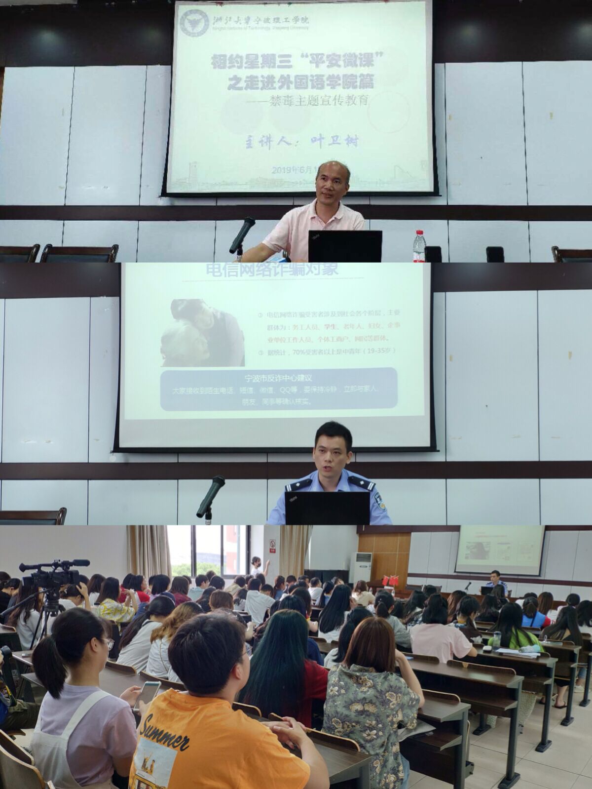 为了进一步提升广大师生防诈骗意识,提升高校思想政治工作的针对性、有效性,建设平安和谐校园,6月12日下午,由学校党委宣传部、保卫处和外国语学院举办的“知行新说”第54讲暨“平安微课” 在SC405会议室举办。本次讲座的主题是禁毒与反诈,由学校保卫处副处长叶卫树和宁波市公安局刑侦支队中队长刘益主讲。