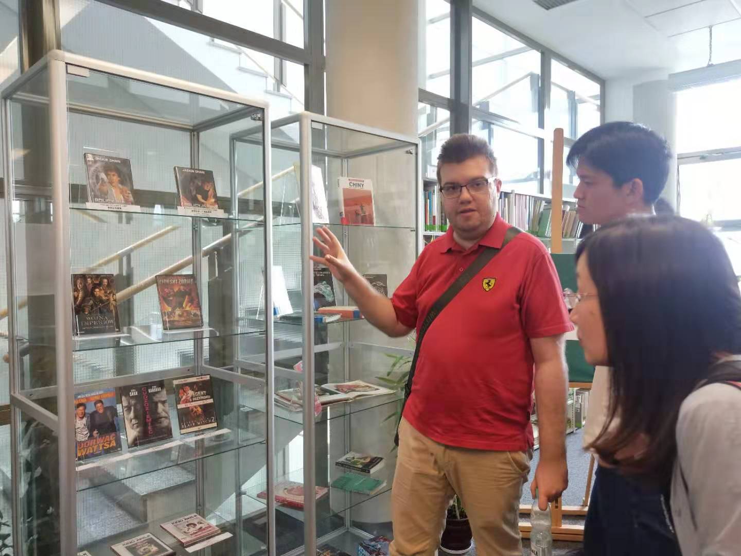 语言课结束之后的图书馆之行令我们印象深刻。首先映入眼帘的便是陈列着中国图书的玻璃柜。成龙的电影、中国的剪纸、中国植物种植,在异国他乡见到这些在国内俯拾皆是的书籍令人倍感亲切。在马奇老师的带领下,学生们参观了有关语言学与文学的书架,并学习使用了早已被机器取代的人工查询箱。