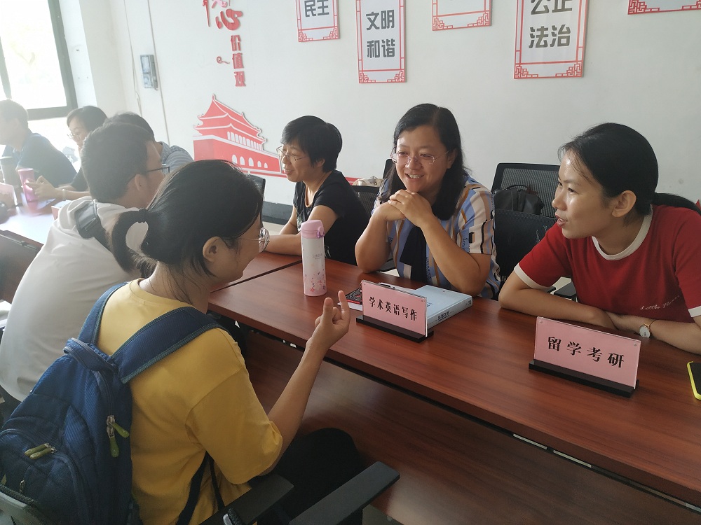 活动现场,支部党员教师们根据个人专长,分成新生始业规划指导、大学英语四六级、BEC、国才考试、留学考研和学术英语写作六个服务窗口,吸引了大批学生前来咨询。参与学生来自各个分院的不同年级。他们结合自身在英语学习方面的困惑与个人发展需求,从大学英语课程的学习方法,大学英语四、六级备考策略,英语相关证书考试信息,考研留学项目信息,以及大学四年的学习规划等方面向老师们虚心请教。党员老师们则根据自身多年的教学经验热情、耐心地为每一位同学答疑解惑。活动现场气氛热烈,师生交流深入。