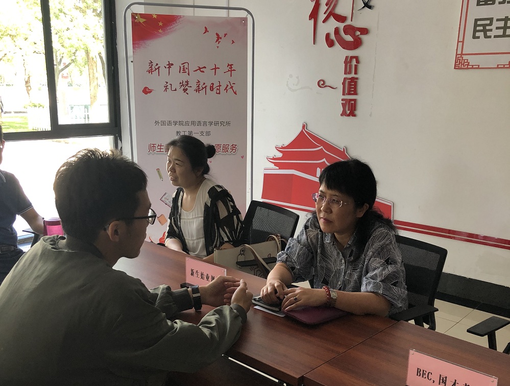 为给我校学生在英语学习方面提供指导,外国语学院应用语言学研究所教工第一党支部全体党员教师利用10月10日中午休息时间,在SC一楼大厅举办了一场“新中国七十年,礼赞新时代”—英语加油站-师生面对面英语志愿服务活动。