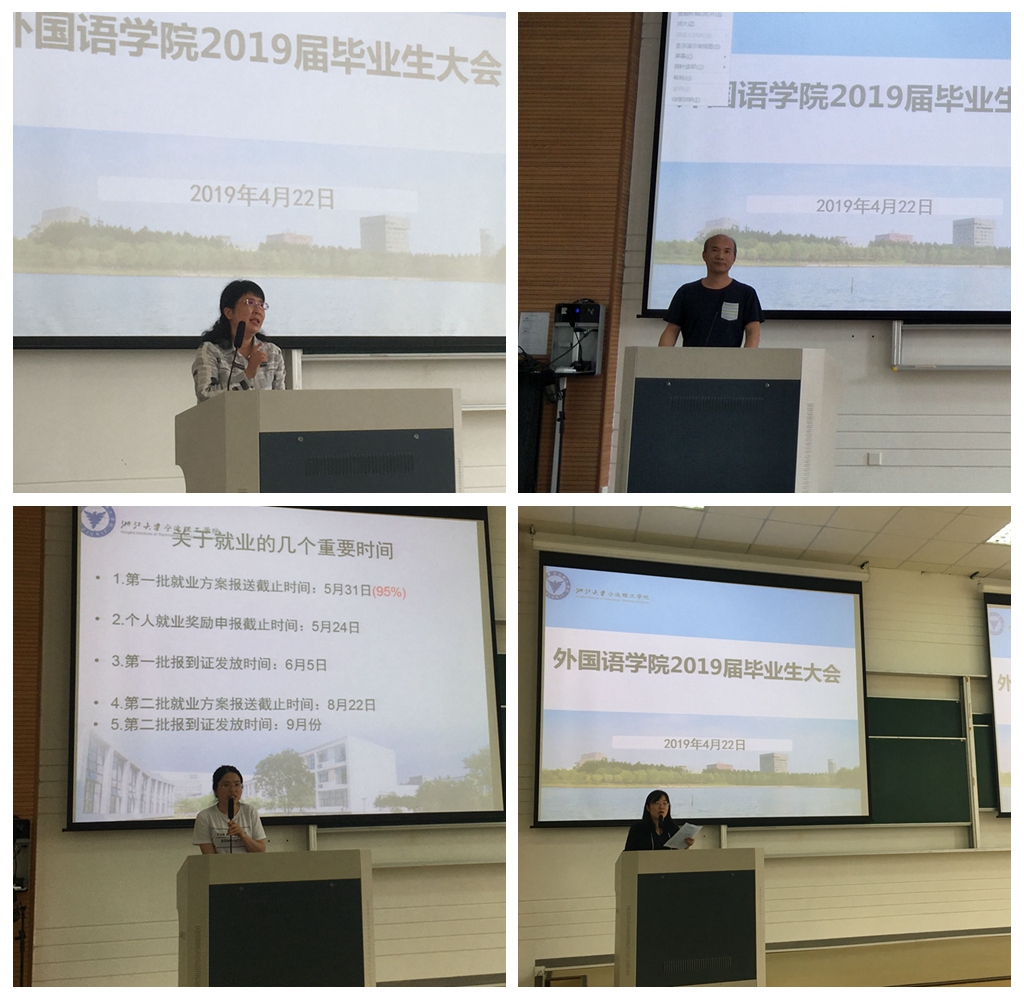 2019年4月22日下午1点30分,外国语学院2019届毕业生大会在SB102教室隆重举行。出席本次会议的有外国语学院党委副书记傅晓宇、副院长周汶、保卫处副处长叶卫树、研究所所长助理欧琛、毕业班班导师以及2019届全体毕业生,会议由外国语学院思政副主管刘杜娟老师主持。