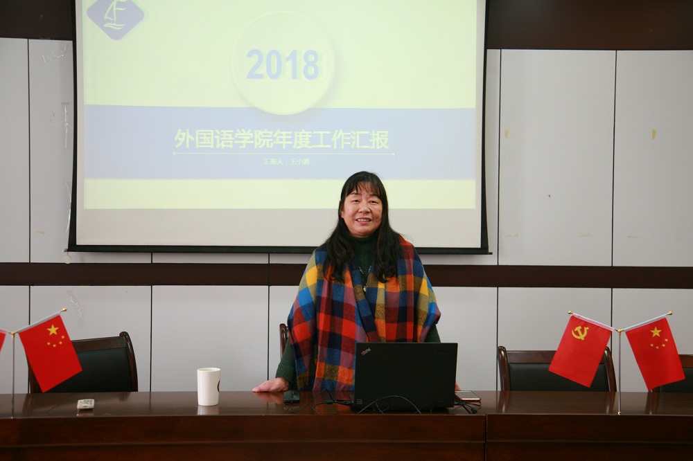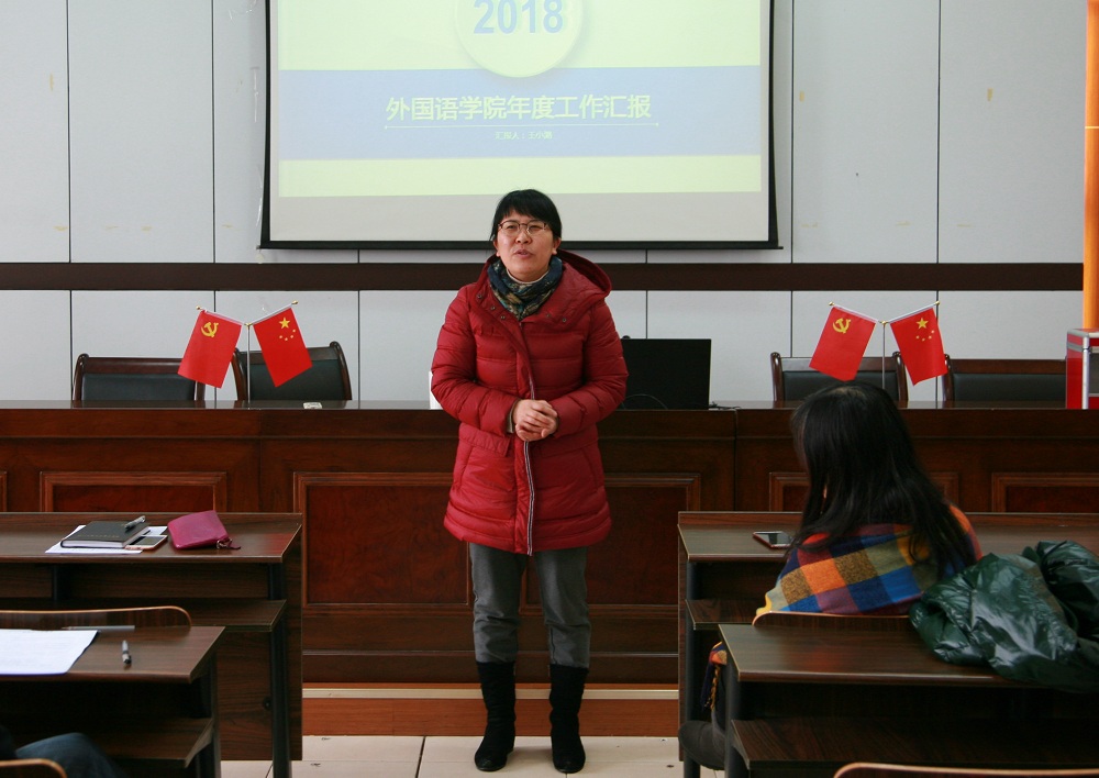 1月11日中午12点,外国语学院在SC405会议室召开2018年度学院工作总结大会,学院班子成员及全体教师参加了会议。会议由党总支副书记傅晓宇老师主持。