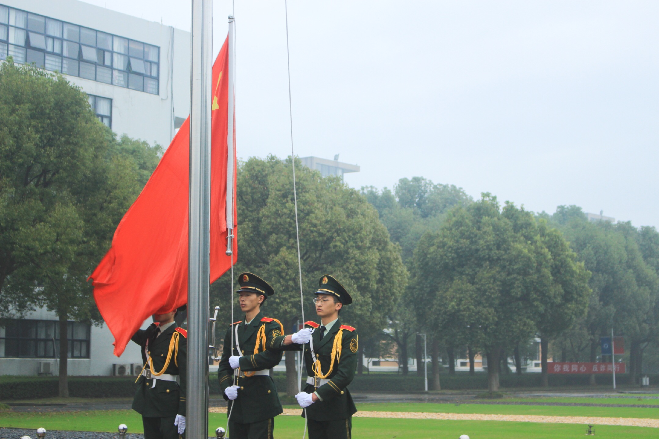 在简短的开场白后,主持人宣布升旗仪式正式开始。仪式第一项,升国旗奏国歌。伴随着响亮的口号声,浙江大学宁波理工学院国旗护卫队踏着整齐的步伐走到国旗台前,步调一致,整齐划一。伴随着国歌奏响,五星红旗在旗杆上冉冉升起,全体师生行注目礼,最终在国歌结束的那一刹那,五星红旗在旗杆的最顶端定格,随风飘扬。整个升旗过程,每位同学都目不转睛地注视着五星红旗,认真对待仪式,彰显了外国语学院学子良好的精神风貌。