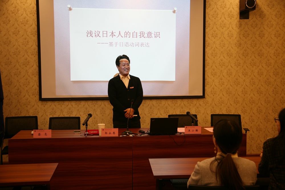接下来郭教授为在场的师生作了题为“浅议日本人的自我意识--基于日语动词的表达”的讲座。郭教授以日语动词表达的特点为中心,从语言背后的“隐性自我”、“被动自我”、“强烈自我”三个方面层层递进、深入浅出地阐述了日本人通过语言体现的特有的“集团化自我意识”。在此基础上又结合日本历史发展剖析了“和魂汉才”到“和魂洋才”转变过程中“和魂”的归属与本质,揭示了日本人的自我意识并非缺失和弱化。为了让在座低年级学生更好的理解,郭教授导入平时学生课堂中的所学的常用表达,对日语与中文进行比较,通过两者之间的差异从语言表现到文化背景由浅入深的进行讲解,给学生们带来了思维上的启发。