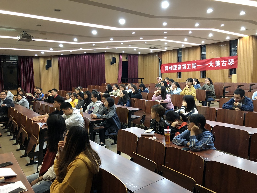 10月15日晚六点半,第五期博雅课堂中国传统民间艺术——“中华国韵,大美古琴”公益讲座在NC103举行。此次大美古琴讲座邀请了宁波红琴馆馆长章蔚红老师作为主讲人,为40余名师生带来了一场古典优雅的视听盛宴。外国语学院副院长蔡亮老师和外国语学院吴会芹老师出席了本次活动。