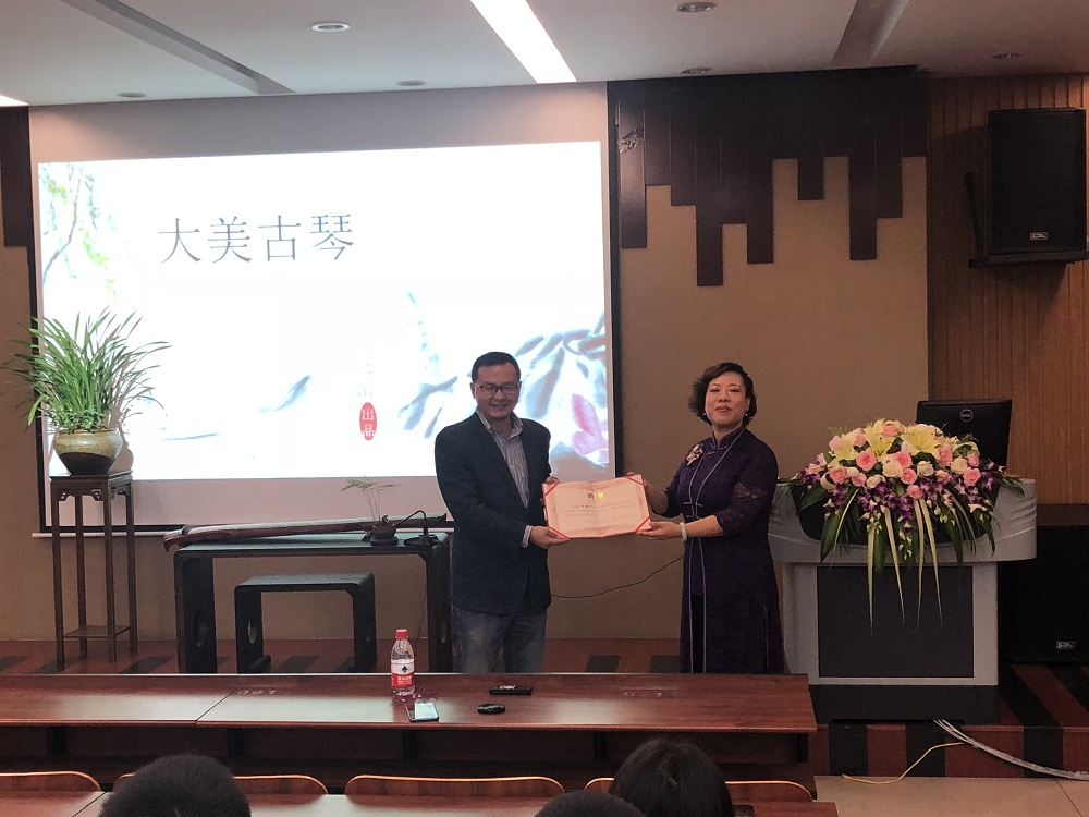 讲座伊始,浙江大学宁波理工学院退休教授吴老师为在座的师生介绍了自己学习古琴的经历,和因寻师习琴与章蔚红老师结下的不解缘分。随后,外国语学院副院长蔡亮老师为本次活动致辞,发表了自己对古典文化传承的看法,并邀请章蔚红老师作为博雅课堂大美古琴专场教授人,为其颁发了聘书。
