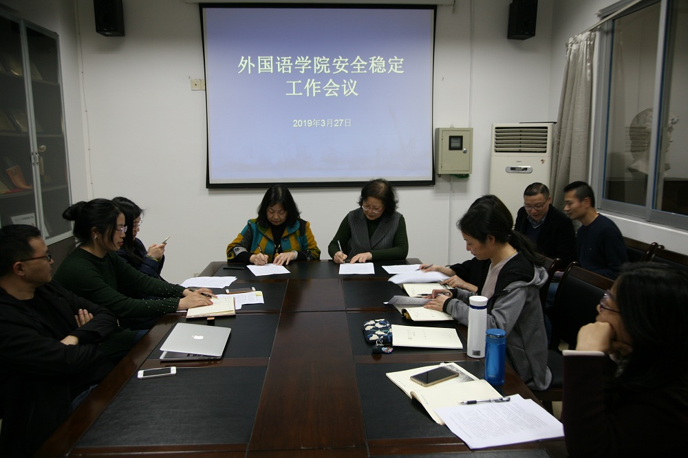 3月27日下午,外国语学院在sc403会议室召开了2019年度安全稳定工作会议,学院王小潞院长、学院党总支傅晓宇副书记和各部门安全责任人参加了会议。会议由傅晓宇副书记主持。