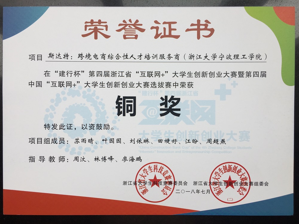 “建行杯”第四届浙江省“互联网+”大学生创新创业大赛暨第四届中国“互联网+”大学生创新创业大赛选拔赛结果揭晓,由外国语学院商务英语专业2015级学生苏雨晴、叶园园、刘依琳、田婕妤、江盼等同学为主要成员组成的跨境电商创业团队,以“斯达特:跨境电商综合人才培训服务商”项目获得该大赛的铜奖。