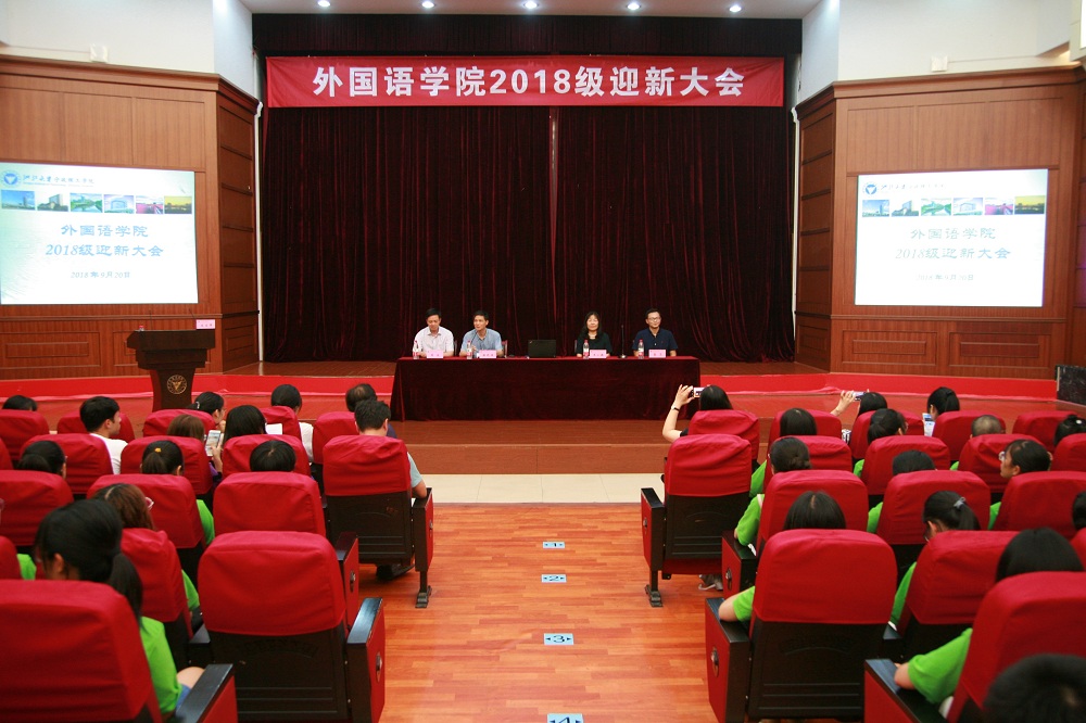 9月20日,浙江大学宁波理工学院外国语学院2018级迎新大会在学校模拟法庭举行。外国语学院党政领导王小潞、谌晓煜、蔡亮和周汶,外国语言研究所负责人、日语专业负责人、新生班导师、教授、党政办、学工办工作人员、班导师助理及177名2018级新生参加了开学典礼。大会由党总支书记谌晓煜主持。