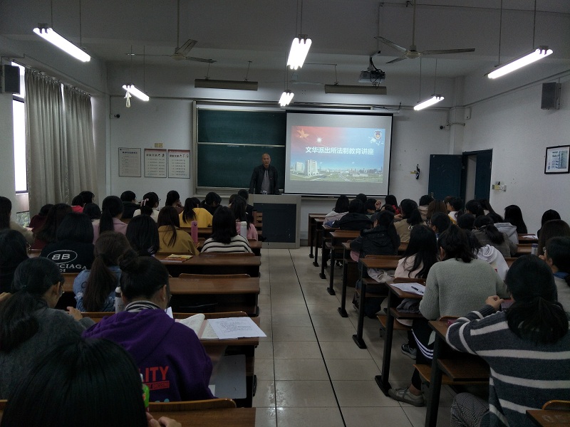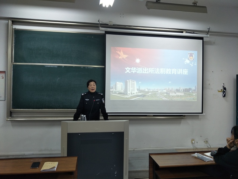 为促进同学们进一步增强安全意识,确保同学们在学校能够安心地学习生活,外国语学院和学校后勤保卫部于12月3日下午3点30分在SB209举行了法制安全讲座,讲座特别邀请鄞州区文华派出所所长胡婷警官为同学们进行培训。当天参加安全教育讲座的有学校后勤保卫部叶卫树老师、外国语学院韩晶晶老师、刘杜娟老师以及外国语学院学生。