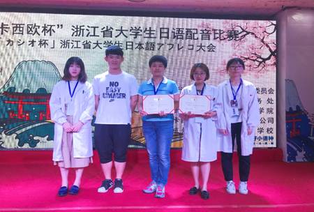 为迎接此次比赛,4月底首先面向全校学生进行了日语配音大赛进行选拔,最终选定由外国语学院日语专业161班的黄嘉杰、周悦、赵培煕及171班的王瑞阳等四名同学组成的代表队代表我校参加5月13日的决赛,他们选取了日本电视剧《外貌协会100%》片段参加决赛,由日语系赵桂琴老师指导并亲自带队。本次比赛历时四小时,参赛选手均是各校的佼佼者,同学们充分展示各自才艺,将自己表演的角色展现得淋漓尽致,竞争十分激烈。最终,浙江大学代表队获特等奖,浙江工业大学、浙江工商大学代表队获一等奖,浙江师范大学等大学代表队获得二等奖,我校四名同学凭借团队合作和极具创意的丹顶鹤精彩片段吸引眼球,最终以总评88分获得三等奖的成绩。