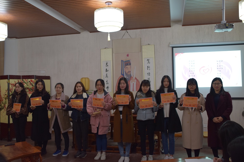 经过个人申报、组织评定,阮吉娜等18名同学被评为外国语学院2017年度优秀志愿者,学院团委书记芦美丽老师为志愿者们颁发了奖状。会上,优秀志愿者代表进行了发言。英语151班何警同学提到,自己在很早之前就加入了家乡的环保志愿者队伍,进入大学以来,她参加了生命关怀志愿服务、龙观乡爱心支教等志愿服务活动不下10场,在帮助他人的同时也锻炼了自己的能力。去年12月,她得知原先的辩论队友、优秀毕业生被确诊为急性白血病而需要大量用血,于是她第一时间联系老师并在学院NIT外语人微信公众号发布,呼吁师生爱心捐血,一时间全校师生纷纷转发,爱的呼唤传遍整个校园,该条微信阅读量达到了26000多,许多师生也纷纷前往献血点进行捐血行动,身体力行。这件由无数小爱汇成大爱的“小事”一直让她暖暖的,也更加坚定了她服务她人的信念。英语153班王云飞同学在发言中提到自己中秋节参加送月饼活动的难忘经历;“我们和阳明乐咖啡的静默咖啡师一起将热气腾腾的自制手工月饼装袋分装,然后冒着细雨,将盛满心意的月饼和咖啡券送到学生公寓的各个角落,为最美的后勤阿姨们送上祝福。很多阿姨对收到的“特别礼物”感到惊喜,也很感谢同学们的惦记……”从与会同学们的讲述中,爱与温暖缓缓流淌,昨晚的阳明学堂也增添了一层别样的美好……