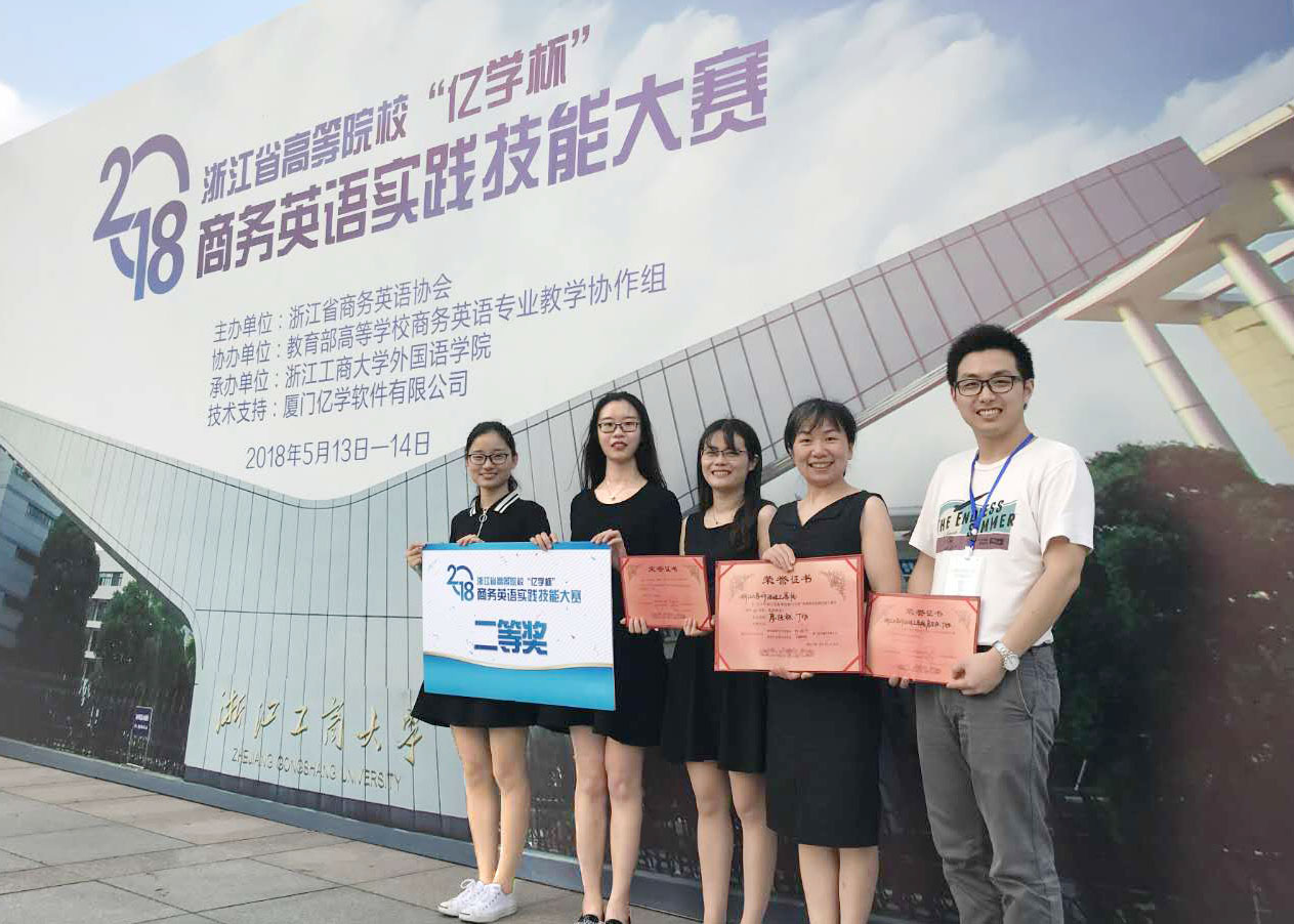 5月14日,由浙江省商务英语协会主办,教育部高等学校商务英语专业教学协作组协办的2018浙江省高等院校“亿学杯”商务英语实践技能大赛在浙江工商大学隆重举行。在我校外国语学院廖佳栋老师和丁旭老师的指导下,由外国语学院的叶园园、苏雨晴、刘依琳组成的队伍经历激烈的角逐,获得了团体二等奖,总分排名第五的好成绩,离一等奖仅一步之遥。