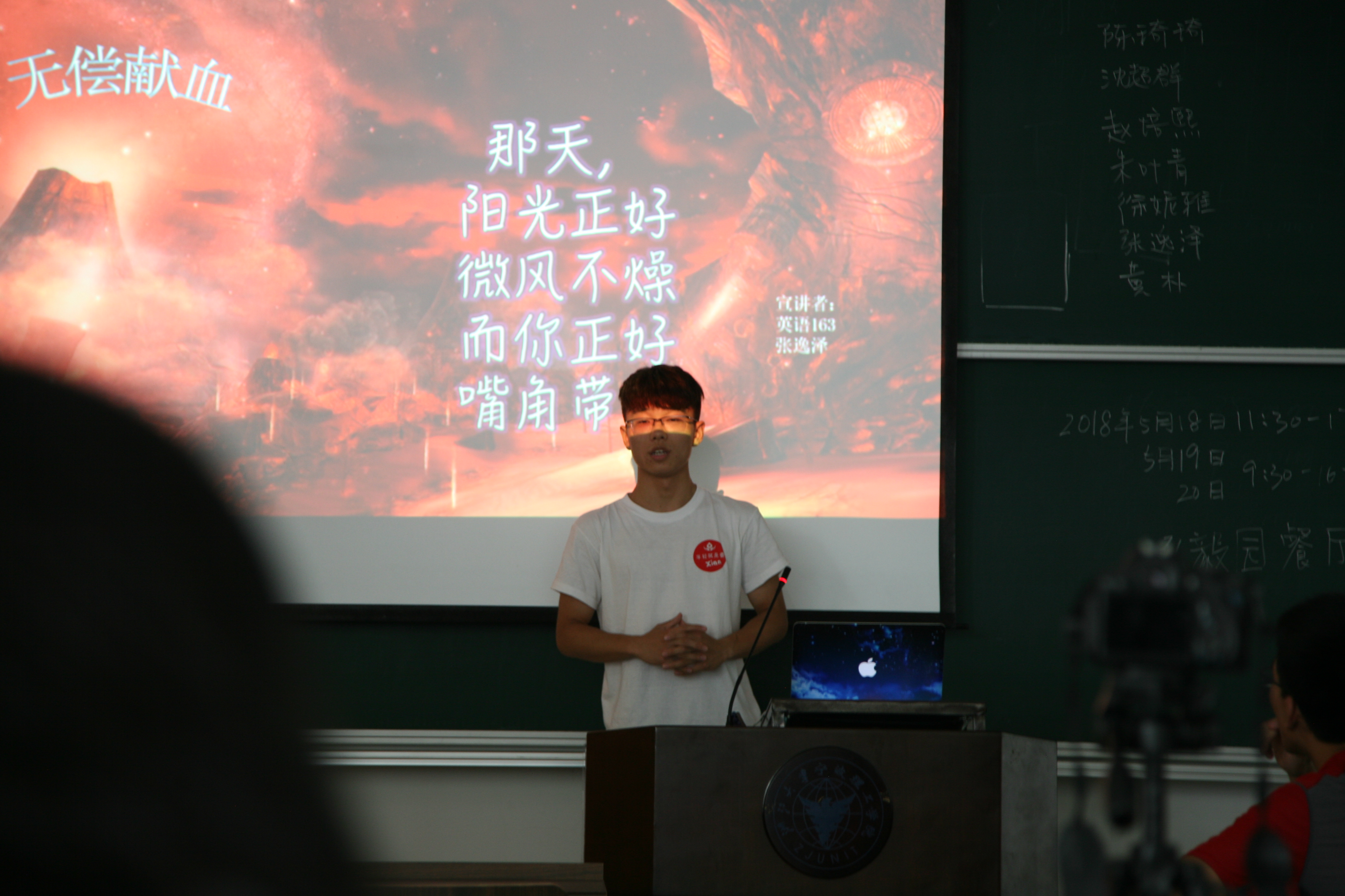 宣讲员陈琦琦和沈超群分别从不同角度向现场师生介绍了献血的基本知识,让同学们了解了献血的年龄、体重、身体素质等基本条件以及献血的方式、献血注意事项等。朱叶青、徐妮雅、张逸泽、黄朴等同学分别围绕献血的意义和大众对献血的误区进行了重点讲解。赵培熙同学则精心准备了一则献血宣传片,动员同学们关心、支持无偿献血工作,呼吁青年大学生参加无偿献血,贡献自己的一份力量。