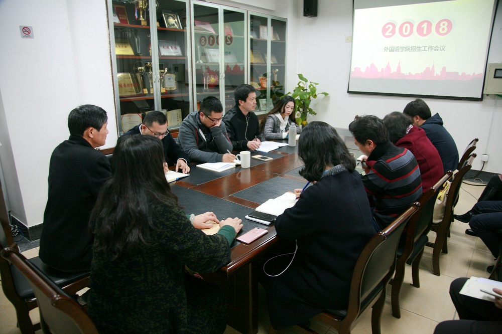 2018年3月16日下午,外国语学院在SC403-7召开2018年招生工作会议。学院招生领导小组成员、各专业负责人以及招生微网负责人参加了会议,会议由教学副院长周汶主持。