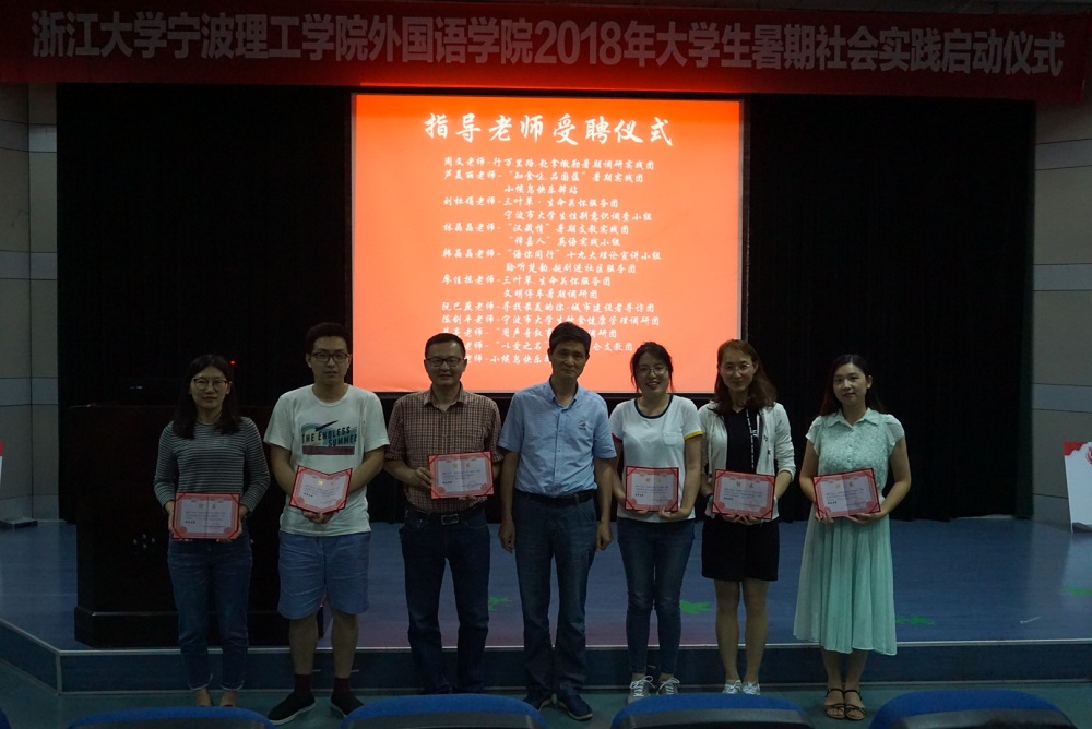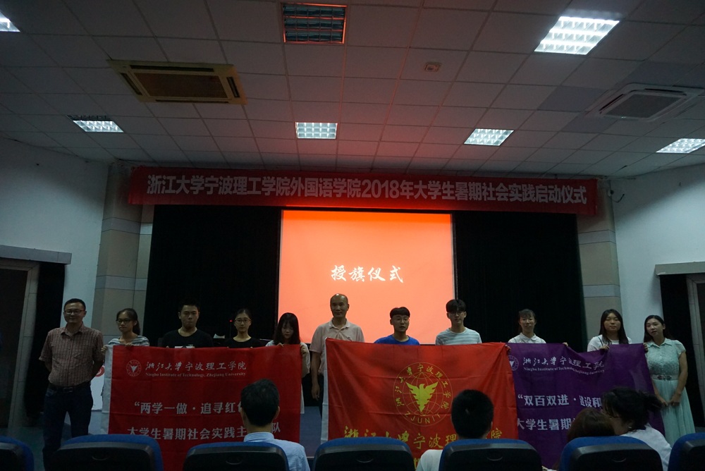 学院团委书记芦美丽就暑期社会实践工作作了部署,希望同学们认真对待,承担好作为大学生和社会成员的责任和使命。思政主管韩晶晶老师宣读了2018年暑期社会实践立项团队名单。校重点项目"用声音叙事"暑期调研团队长金诗诗作为实践队员代表发言,表达对今年实践活动的信心与承诺。团队指导老师代表蔡亮老师则讲述了自己指导实践项目10年来的心路历程,并鼓励同学们勇敢探索。会上,与会领导为各实践团队授旗,学院党总支书记谌晓煜老师为指导老师颁发了聘书。