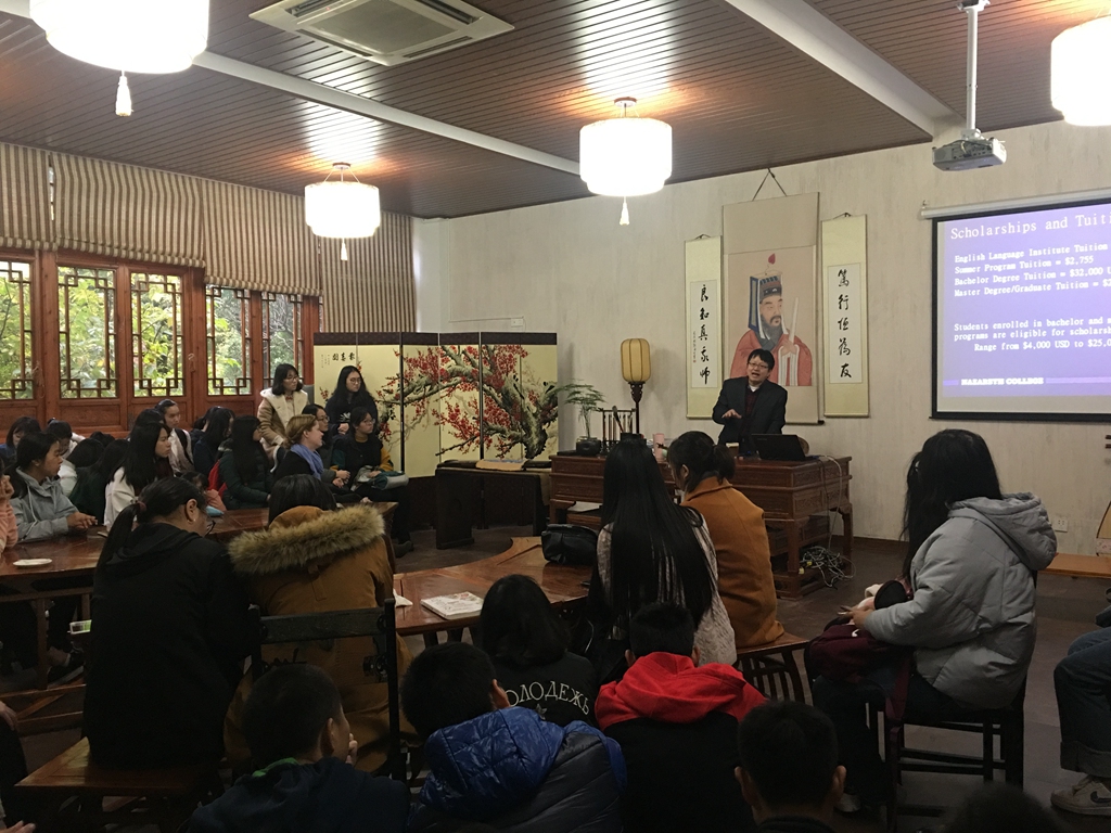 随后,宋红专教授给来自各个学院近五十位同学在阳明学堂进行了一次内容丰富的生动演讲。宋教授主要介绍并推广了我校与拿撒勒大学的三个合作项目,分别是暑期文化体验项目(SAFE),英语强化体验项目(ILEAP学期或学年项目)和硕士项目(TESOL,学前教育和经济管理)。同学们听得非常认真,并积极向宋教授提问,问题包括拿撒勒大学的生活环境、饮食起居、业余生活等问题。宋老师也耐心详尽的回答了同学们的提问。本次讲座气氛热烈,互动频繁,宾主尽欢。阳明学堂济济一堂,数名同学没有位置也坚持站着听完了近一个小时的讲座,当场就有一位英语专业的同学报名参加了暑期项目,达到了很好的效果。讲座结束后,在我校老师和同学们的欢送下,宋教授一行圆满结束了对我校的这次访问。