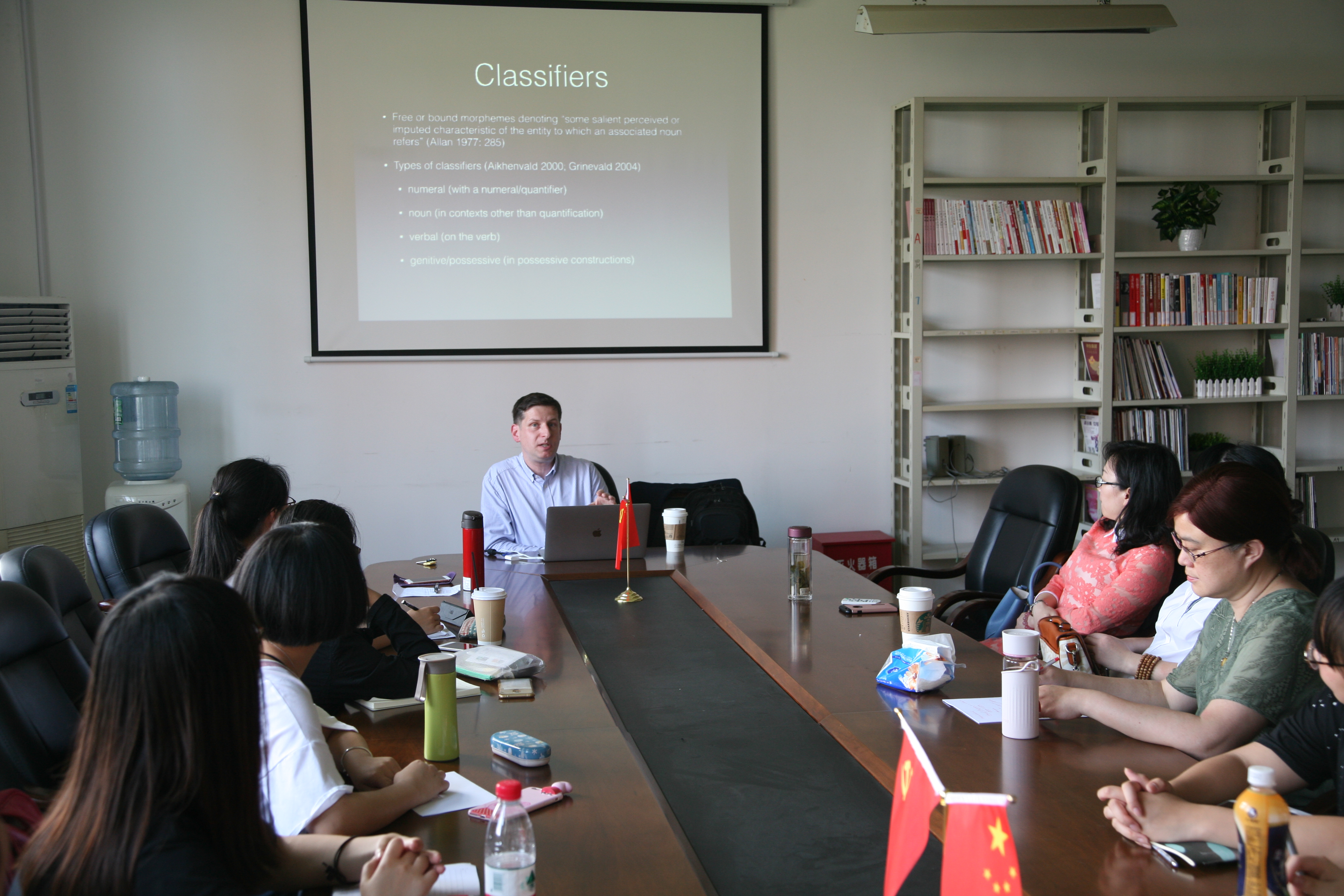 Kilarski教授在讲座上为在座的师生打开了全新的一个学习和研究的领域,从名量词的定义,到名量词和文化及认知的关联,从名量词的语义和语用的作用,到名量词研究的新领域等各方面,深入浅出做了介绍。讲座后师生们积极就自己感兴趣的话题跟Kilarski教授进行了进一步的交流,学院谌晓煜书记也跟Kilarski教授和其他老师一起合影。