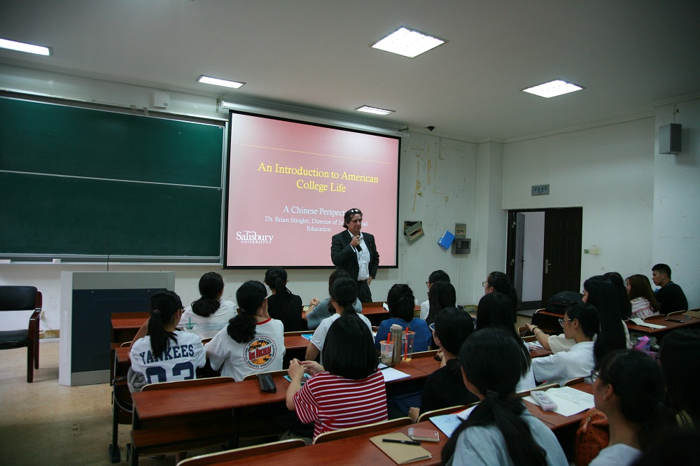 值此开学之际,斯蒂格勒博士首先为我校学生带来了一场的名为“An Introduction to American College Life”的讲座,偌大的SC103阶梯教室,此时却座无虚席。他从美国文化的角度比较了中美大学的差异,从宿舍生活到考试制度,从择校标准到校园文化,慢慢揭开美国大学生活的神秘面纱。风趣幽默的语言和对比夸张的图片,引得同学们发出阵阵笑声。讲座后学生们积极提问和斯蒂格勒博士进行互动交流,了解中国学生在美国高校学习的优势与挑战以及我校与索大的交流项目。