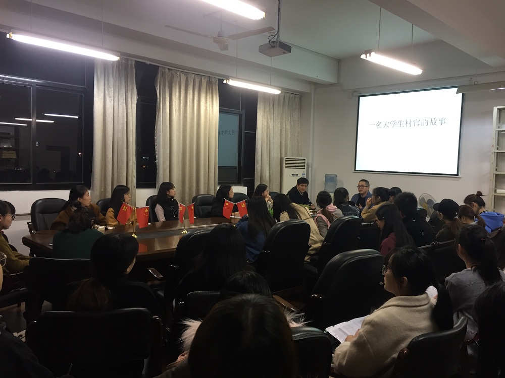 11月27日晚上,在SC408,外国语学院2011级优秀毕业生党员王宽跟外国语学院的学生党员和志愿者们相聚一堂,分享了他作为一名90后大学生村官的故事。参加此次座谈会的还有外国语学院党总支书记谌晓煜老师,学生支部书记韩晶晶老师、刘杜娟老师,以及团委书记芦美丽老师。