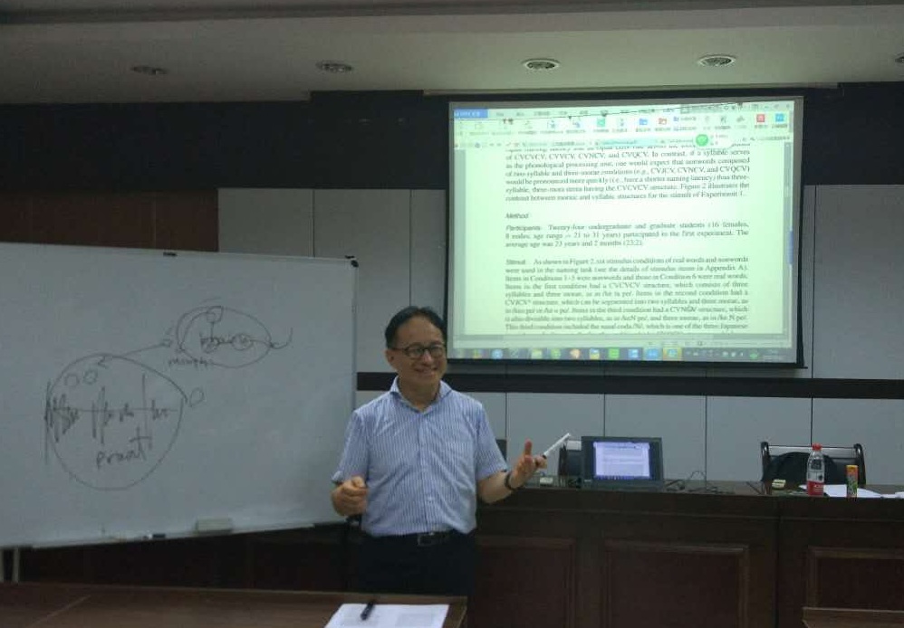 9月19日下午,日本名古屋大学玉冈贺津雄教授应邀来我校外国语学院SC405会议室做了题为“日语语音处理的实验检证”的学术讲座。教授是日本国内知名的心理语言学家。为了满足更多非日语学习者的听讲要求,此次讲座全程用英语演讲,讲座由日语专业黄郁蕾老师主持。