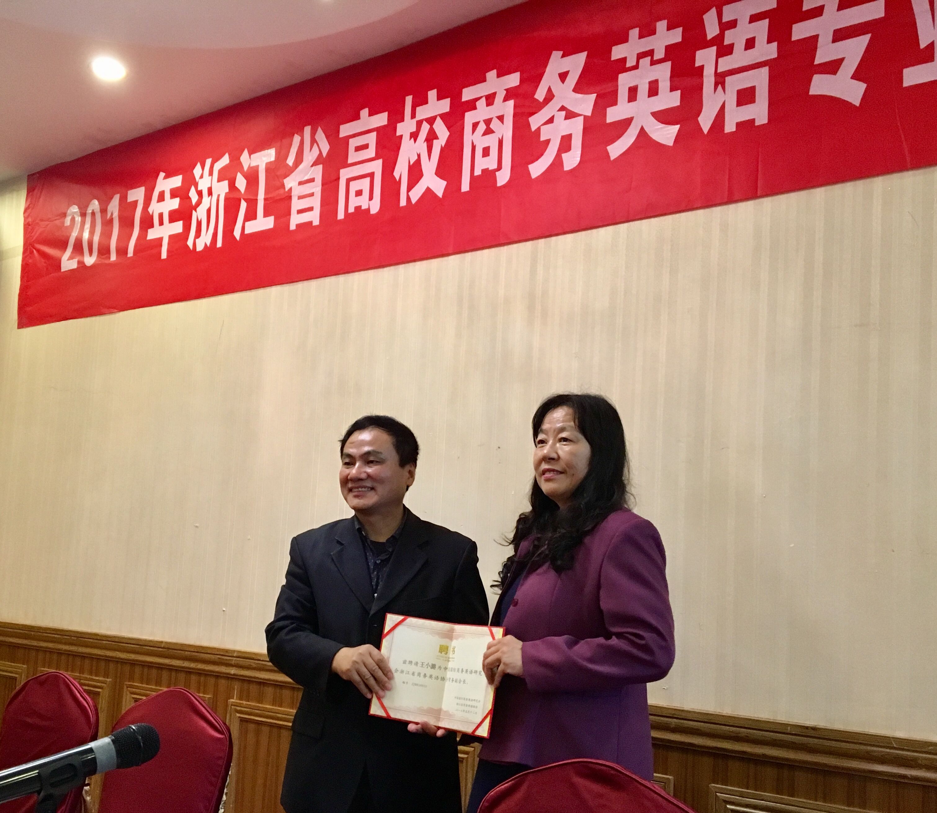 2017年5月12日—13日,浙江省高校商务英语专业建设与教学模式研讨会在浙江工商大学举行,来自省内各高校的50名商务英语专家和教师参加了此次盛会。我校外国语学院王小潞院长和陈黎峰副教授参加了本次会议。本次大会增聘和续聘了浙江省商务英语协会副会长和常务理事若干名。我院王小潞教授被聘为浙江省商务英语协会副会长、周汶副教授被聘为常务理事。