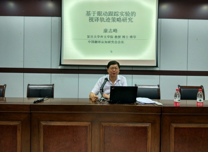 第一场学术讲座由康志峰教授主讲,他以“基于眼动跟踪实验的视译轨迹策略研究”为题,阐述了通过使用眼动仪等当代先进的精密工具,对从事语言翻译工作者在工作过程中阅读文本时的眼睛运动和注视方向进行记录,并进行相关的研究分析。这些研究主要围绕视译过程中的认知负荷、阅读模式、源语干扰、翻译策略和翻译错误等展开。康教授认为,眼动跟踪技术能够客观科学地记录语言加工活动中的认知负荷,将眼动技术引入视译研究,有助于从心理认知角度揭示视译的认知过程,并在眼动指标和翻译活动间。