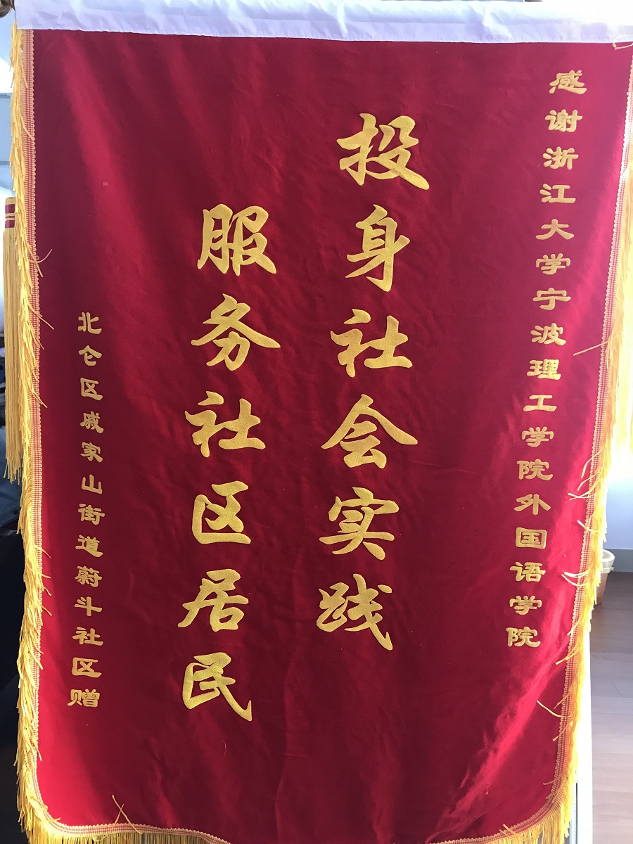 10月25日,外国语学院收到北仑区蔚斗社区送来的一面“投身社会实践.服务社区居民”的锦旗,感谢2017年外国语学院师生对蔚斗社区外来民工子女的爱心支教服务。