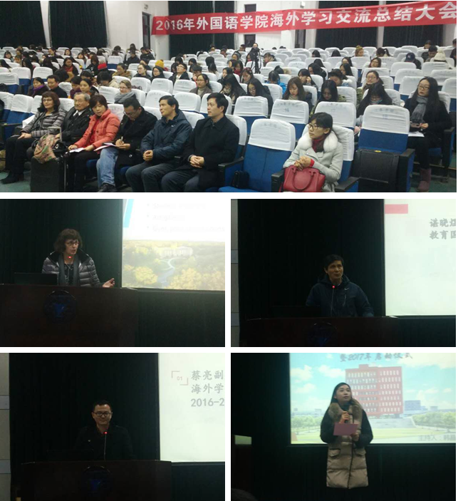 12月27日晚,外国语学院2016年海外学习交流总结大会暨2017年工作启动仪式在NF103举行。学院党总支书记谌晓煜、副院长蔡亮、日本淑德学校校长钱高莉英、美国拿撒勒大学苏珊娜(英译)老师、各研究所及专业负责人、学院游学项目全体带队教师、全体辅导员、2014-2015级全体学生参加了活动。