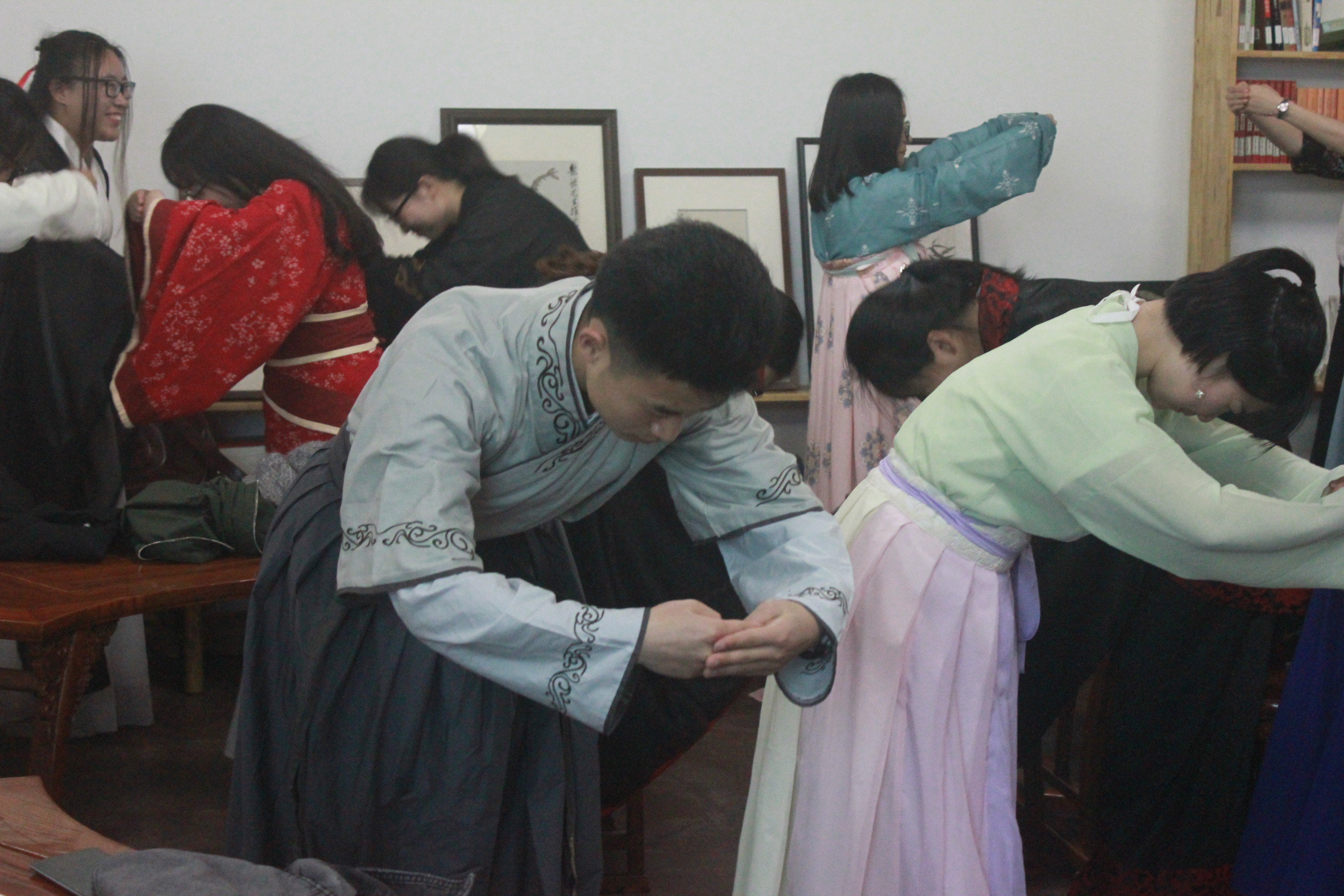 讲座打破以往静态讲授的模式,现场师生或翠袖红裙、绮衣锦裳,或宽袍广袖、峨冠博带,或木钗布裙、白褂青衫...宛若穿越回了汉唐时代,通过体验式教学,学员们着汉服、学礼仪、传文化,整场讲座变得立体而又生动,充满了趣味。活动中,史项杰老师介绍了汉服与汉族的关系和渊源,并对汉服的历史、服饰结构、款式类型、配饰发型、特点、文化内涵、礼仪等进行了重点介绍和展示。通过体验,同学们对汉服的印象不再仅仅停留于投影仪的图片上。现场很多同学踊跃提问,展现了对汉服的浓厚兴趣。学校子衿汉服社的社员们也为现场师生即兴表演了一段汉舞,他们将汉服的薄纱与舞蹈的柔美结合,生动展示了汉服文化的意蕴深长。