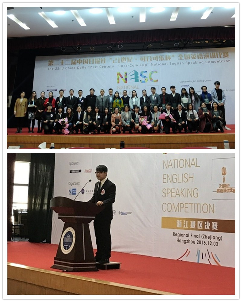 2016年12月2日至3日,我校外国语学院14级英语专业厉修远同学代表学校参加了在杭州浙江外国语学院承办的第二十二届“21世纪 • 可口可乐杯”全国英语演讲比赛浙江地区决赛,并以全场总分排名第二的成绩获得省亚军,成功晋级明年三月的全国总决赛。