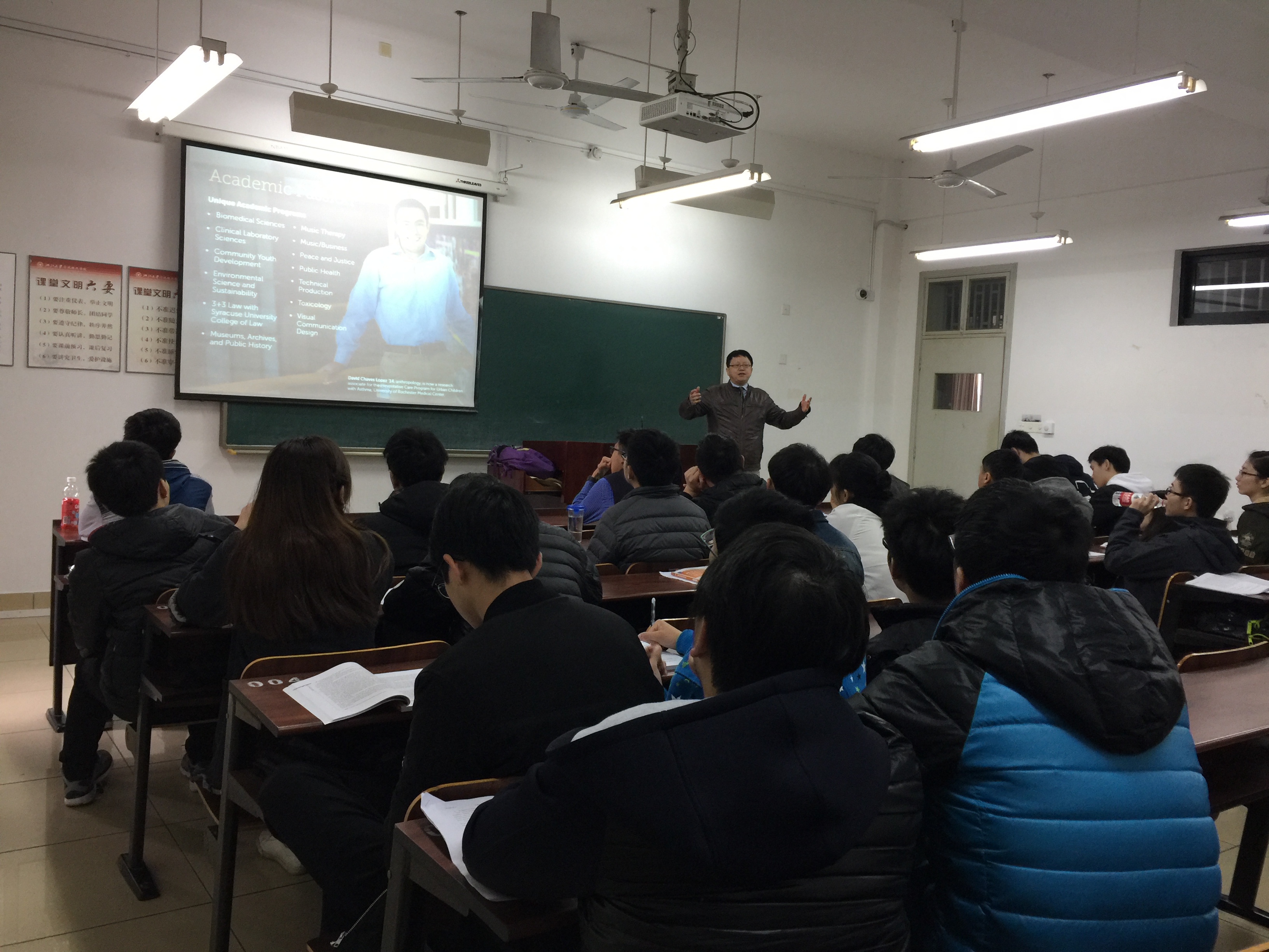 宋教授是外国语学院的老朋友,这是宋教授第三次到访我院。宋教授刚刚到达学校就前往NB211教室,给同学们做了一场名为《走好人生的一小步—美国高等教育的现状》的讲座,他介绍了美国的高等教育相关的文化知识和美国大学的概况,他给我校学子提出了几点建议,他希望他们有机会到国外去学习进修,拓展国际视野,使自己成为有国际竞争力的人才。讲座后学生们积极提问和教授进行互动交流。