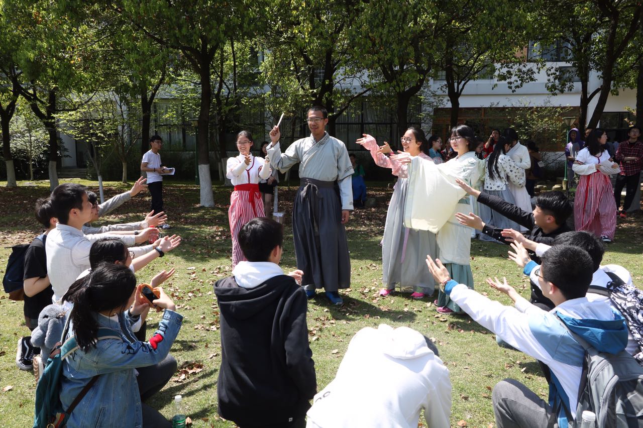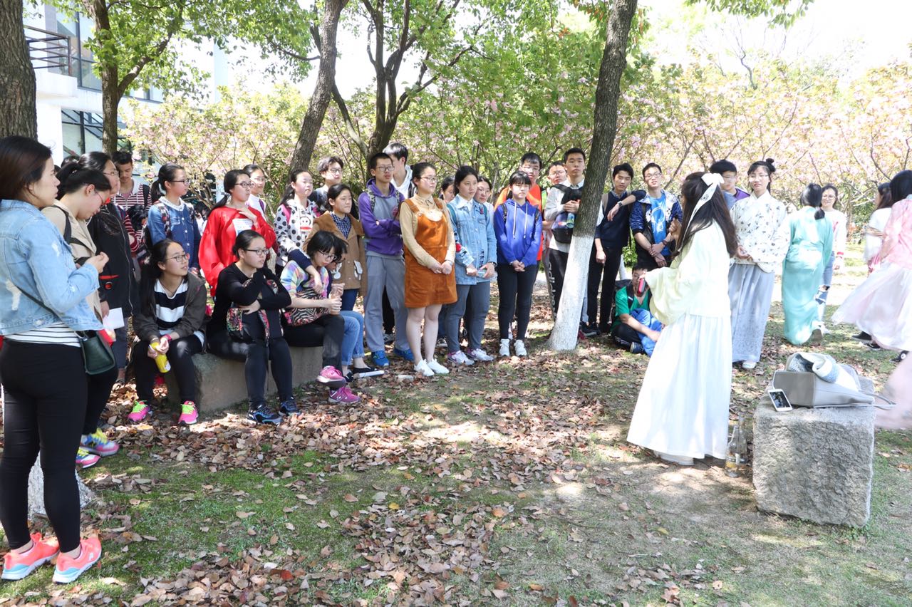 活动中,外国语学院副院长蔡亮老师以讲座的形式向来访师生介绍了阳明学堂的总体情况和阳明精神内涵,阳明文化讲解员带领师生参观了阳明•心境文化空间、阳明雕像、阳明圣迹图、浙东文化墙、上善若水公益展示墙以及学堂主体,并对阳明先生生平事迹、阳明文化传播现状、特色项目如“博雅课堂”、“琵琶美学研修”、“阳明乐咖啡”等进行了生动讲解,子衿汉服社的同学们则为来访师生带来了汉服表演和试穿体验活动。值得提出的是,为了增加活动的趣味性,阳明学堂文化讲解员特意着汉服进行接待宣讲,商英161班王雯林同学也在现场弹奏了古筝,当古色古香的阳明学堂配上温文典雅的汉服和悠扬的古筝曲调,整个活动充满了诗情画意,别有一番风味。活动尾声,阳明学堂接待团队还设计了趣味游戏问答,宁波外国语学校的同学踊跃参与,气氛热烈,充满了欢声笑语。