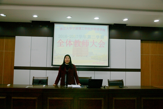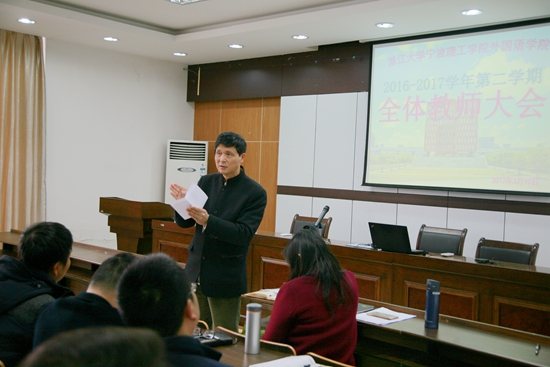 3月10日下午,外国语学院召开新学期全体教师大会议,学院党政领导班子和全体教师参加了会议,会议由学院党总支书记谌晓煜主持。