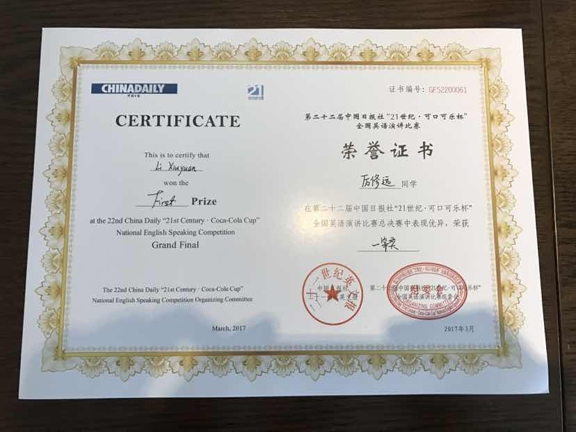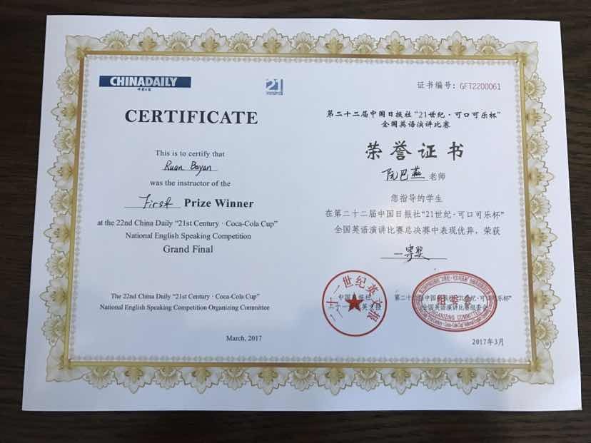 2017年3月24-26日,我校学子外国语学院的厉修远同学参加了在南京大学举办的第22届中国日报社“21世纪.可口可乐杯”全国英语演讲比赛,获得全国总决赛(大学组)一等奖的好成绩,指导老师外国语学院的阮巴燕老师获得全国指导老师一等奖。