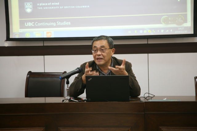 11月30日下午2点,加拿大英属哥伦比亚大学(UBC)大学孙浪教授莅临我校,在SC405会议室为我校师生做了题为“中西方教育体系对比”的讲座。孙浪教授目前在加拿大英属哥伦比亚大学(2016-2017年英国泰晤士世界大学排行第33位)继续教育学院担任语言文化系主任一职,在管理行政的同时也担任教学工作。